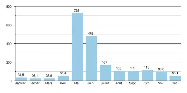 Le débit moyen mensuel observé en mars (minimum d'étiage) est de 23,6 m3/s, soit plus ou moins 3 % du débit moyen du mois de mai (725 m3/s), ce qui souligne l'amplitude très élevée des variations saisonnières. Sur la durée d'observation de 15 ans, le débit mensuel minimal a été de 14,7 m3/s en , tandis que le débit mensuel maximal s'élevait à 1 280 m3/s en .
