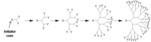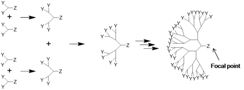 Dans la synthèse des dendrimères, les monomères mènent à un polymère monodispersé, tel un arbre[4]. Il y a deux méthodes définies de synthèse des dendrimères : synthèse divergente[5],[6] et synthèse convergente[7]. La première assemble la molécule du noyau jusqu'à la périphérie et le second de l'extérieur vers le noyau.