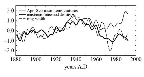 - ↑ Jacoby, G. C.; d'Arrigo, R. D. (June 1995), "Tree ring width and density evidence of climatic and potential forest change in Alaska", Global Biogeochemical Cycles, 9 (2): 227, Bibcode:1995GBioC...9..227J, doi:10.1029/95GB00321, The recent increase in temperatures combined with drier years may be changing the tree response to climate.
