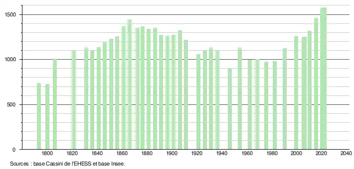 L'évolution du nombre d'habitants est connue à travers les recensements de la population effectués dans la commune depuis 1793. Pour les communes de moins de 10 000 habitants, une enquête de recensement portant sur toute la population est réalisée tous les cinq ans, les populations de référence des années intermédiaires étant quant à elles estimées par interpolation ou extrapolation[9]. Pour la commune, le premier recensement exhaustif entrant dans le cadre du nouveau dispositif a été réalisé en 2005[10].