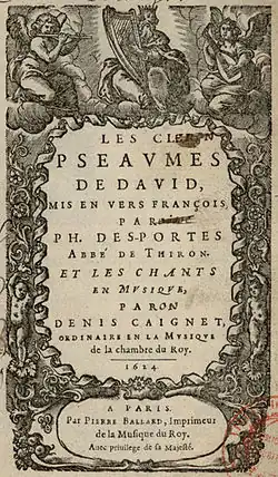 - Les CL Pseaumes de David, mis en vers françois, par Philippe Desportes... les chants en musique. Paris : Pierre I Ballard, 1624. 1 vol. 8°. RISM C 31, Guillo 2003 n° 1624-B.