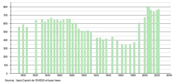 L'évolution du nombre d'habitants est connue à travers les recensements de la population effectués dans la commune depuis 1793. Pour les communes de moins de 10 000 habitants, une enquête de recensement portant sur toute la population est réalisée tous les cinq ans, les populations de référence des années intermédiaires étant quant à elles estimées par interpolation ou extrapolation[20]. Pour la commune, le premier recensement exhaustif entrant dans le cadre du nouveau dispositif a été réalisé en 2004[21].