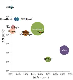 Voici les degrés API de quelques pétroles produits à travers le monde, du plus léger (meilleure qualité) au plus lourd :