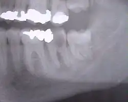 Lorsque la dent bute sur le collet de la deuxième molaire, elle est bloquée dans son extériorisation. On dit qu'elle est « enclavée ».