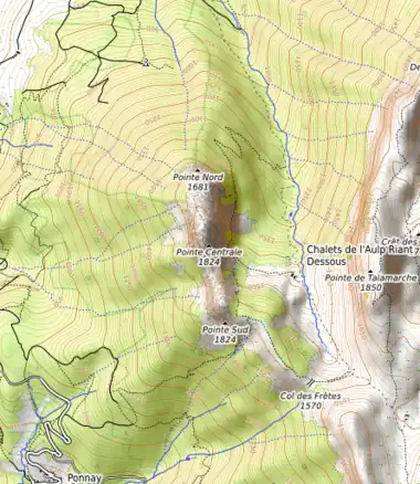 La montagne aux pentes abruptes et boisées est couronnée d'une falaise de calcaire urgonien d'environ 200 mètres de hauteur[3]. Fortement découpée par l'érosion, cette barre rocheuse forme trois pics principaux, la pointe Nord, la pointe Centrale avec 1 828 mètres d'altitude et la pointe Sud avec 1 791 mètres d'altitude[1].