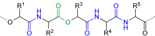 - ↑ (en) « depsipeptides », IUPAC, Compendium of Chemical Terminology [« Gold Book »], Oxford, Blackwell Scientific Publications, 1997, version corrigée en ligne : (1995), 2e éd. (ISBN 0-9678550-9-8)