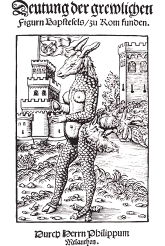 L'humaniste, philosophe et réformateur protestant Philippe Mélanchthon décrit les parties du corps du Der Papstesel dans une satire anti-pontificale féroce, qui identifie dans les caractéristiques de l'animal les maux et les dégénérations de l'Église, dont l'apparition divine démontre que l'Église est tombée entre les mains de l'Antéchrist[3] :