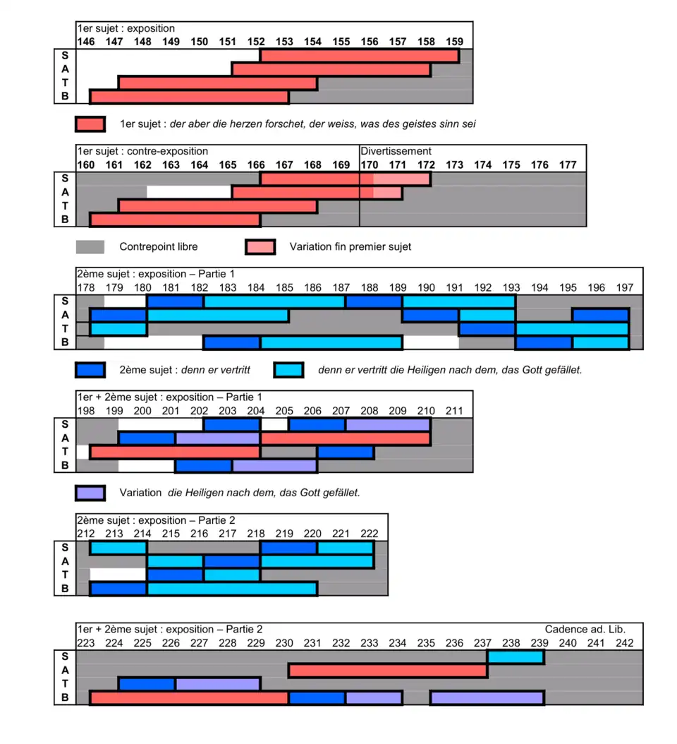 Le premier sujet (Der aber), commençant par une quarte ascendante, est autoritaire[Ca 3] et son ton majeur clair contraste avec le ton mineur incertain de la fin de la première partie[Jo 1]. Le second sujet (denn er vertritt) est presque le renversement de la première, commençant par une quinte descendante, comme pour marquer l'antithèse de la première phrase[Ca 3]. Les deux sujets se combinent sur la fin, formant une véritable double fugue.