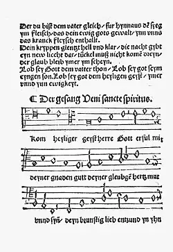 La mélodie est d'un compositeur anonyme du XVe siècle, similaire à l'hymne Adesto, sancte spiritus de Marchetto da Padova (composé vers la fin du XIIIe siècle)[6].