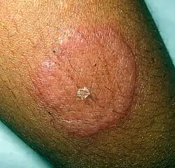 Il se manifeste par une tache arrondie, rouge et squameuse, qui s'étend progressivement, la zone centrale devenant plus claire et cicatricielle, la périphérie étant rouge, squameuse ou vésiculaire. Unique ou multiples, il existe des formes cliniques trompeuses.