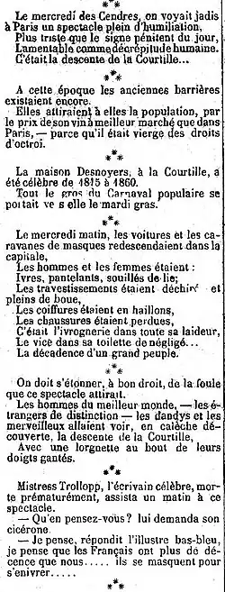 - ↑ Extrait de l'éditorial de Timothée Trimm 9 février 1864, Le mercredi des Cendres, Le Petit Journal, 10 février 1864, page 1, 2e colonne. Il s'agit ici d'une partie des propos sur la descente de la Courtille que contient cet éditorial.