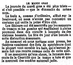 La Presse, le , se plaint de l'envahissement du Carnaval de Paris par la publicité. À cette occasion, le journal parle de la descente de la Courtille : ... « aujourd'hui, on ne fait plus que des affaires, n'est-à-dire de la publicité. Nous ne serions pas surpris que le personnel de cette grande débâcle carnavalesque qui s'appelle la descente de la Courtille se composât en grande partie, demain matin, d'hommes-affiches, de colporteurs de prospectus et de crieurs d'adresses[18]. »