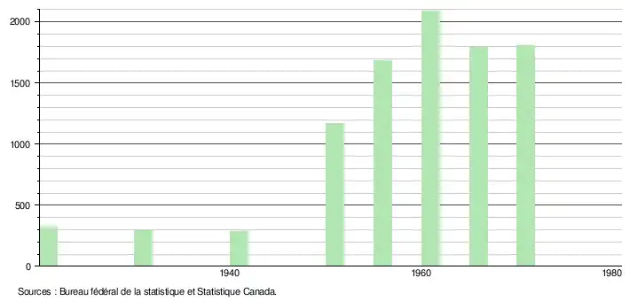 - ↑ Bureau fédéral de la statistique, recensements du Canada pour les années 1921, 1931, 1941, 1951, 1956, 1961 et 1966.