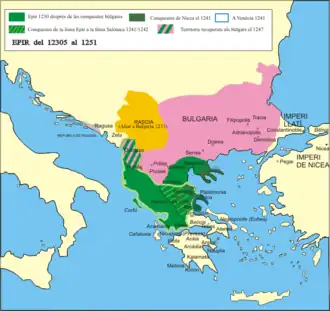 La rivalité entre l’Épire et l’empire de Nicée ne devait pas cesser pour autant. Théodore, qui s’était retiré au château de Vodena (aujourd’hui Édesse) sur la nouvelle frontière entre l’Épire et l’empire de Nicée, encouragea Michel II Comnène Doukas (despote 1230- mort entre 1266 et 1268) à reprendre les prétentions au trône impérial en Europe. Au début, le mariage de Michel II avec une princesse de la famille impériale de Nicée lui avait permis d’établir des relations cordiales avec Jean III Doukas Vatatzès, lequel lui conféra en 1249 la dignité de despote, titre utilisé pour la première fois de façon officielle. Ces bonnes relations permirent à Jean III Vatatzès d’obtenir la neutralité de l’Épire pendant qu’il partait à la conquête de Thessalonique[19].