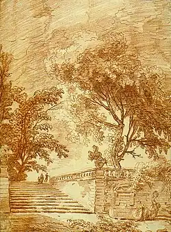 Paysage avec des escaliers | dessin | 1770s | sanguine | musée d'art du comté de Los Angeles |