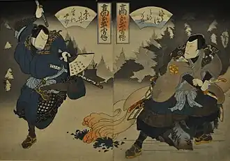 Le diptyque est tiré d'une représentation de la pièce mise en scène au cours du huitième mois de 1848 au théâtre Kado d'Osaka[5]. L'impression à droite est celle de l'acteur Ichikawa Ebizō en Uji Hyōbu-no-suke (宇治兵部助) (également Uji Jōetsu (宇治常悦)), version romancée du chef rebelle Yui Shōsetsu. La gravure de gauche montre Arashi Rikan en Kanae Tanigorō (金井たに五郎) (également 金江谷五郎 (Kanai Yagorō)).