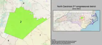 Le 2e district congressionnel de Caroline du Nord est situé dans la partie centrale de l'État. Le district contient la majeure partie du Comté de Wake. Avant le redécoupage ordonné par le tribunal en 2019, il comprenait également le nord du Comté de Johnston, le sud du Comté de Nash, l'extrême ouest du Comté de Wilson et la totalité des comtés de Franklin et Harnett. Le 2e district est représenté par la Démocrate Deborah Ross depuis 2021.