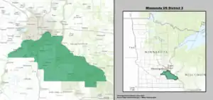 Le 2e district congressionnel du Minnesota couvre la région métropolitaine sud de Twin Cities et contient la totalité des comtés de Scott, Dakota et Le Sueur. Il contient également une partie du nord et de l'est du Comté de Rice, y compris la ville de Northfield, ainsi que le sud du Comté de Washington, y compris la ville de Cottage Grove. Lakeville et Eagan sont les plus grandes villes du district. Historiquement, pendant de nombreuses décennies au milieu du siècle, le 2e district couvrait le coin sud-ouest de l'État, tandis que le 1er district couvrait la majeure partie de cette partie de l'État.