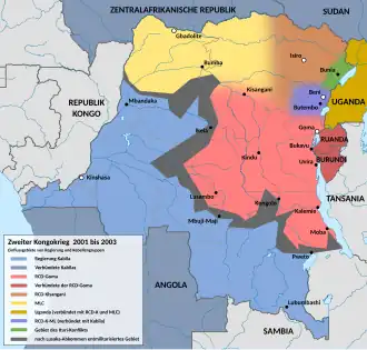 La deuxième guerre du Congo est un conflit armé qui se déroule sur le territoire de la république démocratique du Congo (RDC, anciennement Zaïre) de 1998 à 2002, avec une fin formelle le . Cette guerre implique neuf pays africains, et une trentaine de groupes armés, ce qui en fait la plus grande guerre entre États dans l'histoire de l'Afrique contemporaine. Elle est aussi surnommée la « grande guerre africaine » ou encore la « (première) guerre mondiale africaine »[3],[4]. Elle est aussi nommée « deuxième guerre de libération nationale »[4].