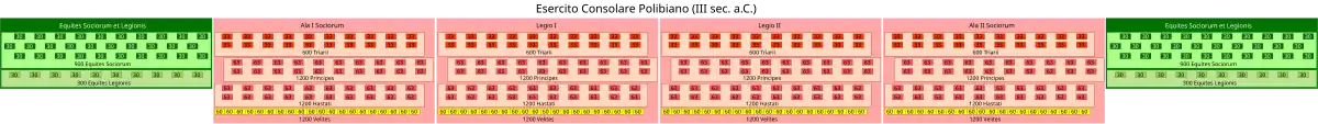 | En 218 av. J.-C., 6 légions soit 24 000 légionnaires et 1 800 cavaliers ; Alliés : 40 000 fantassins et 4 400 cavaliers ; flotte : 220 quinquérèmes[A 1] En 216 av. J.-C., 8 légions soit 81 000 légionnaires et entre 9 600 et 12 800 cavaliers[1] Alliés : 81 000 fantassins et plus de 30 000 cavaliers[1] En 211 av. J.-C., 115 000 fantassins et 13 000 cavaliers, ainsi que deux flottes de 150 navires. |