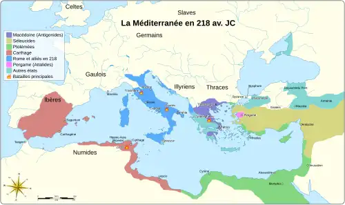 La deuxième guerre punique est le deuxième des trois conflits connus sous le nom de guerres puniques, qui opposent Rome à Carthage. Plus précisément, ce conflit se déroule au IIIe siècle av. J.-C., de 218 à 203 en Europe, puis de 203 à 201 en Afrique.