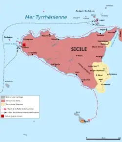 La première action militaire de Rome est de mettre le siège devant la forteresse carthaginoise de Melita, située sur l'île de Malte[25]. La garnison de la forteresse, composée de 2 000 hommes, se rend rapidement sans combattre[25]. La Sicile occidentale et les îles Éoliennes bénéficient de l'envoi de renforts[26].