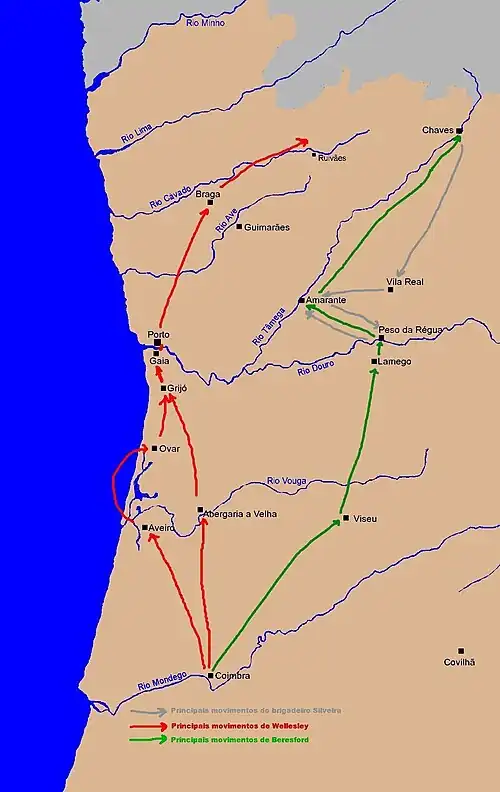 La colonne de Beresford initie son mouvement vers le nord le 6 mai, atteint Viseu le 8 et unit ses troupes à celles du brigadier Silveira le 10. La colonne de Wellesley entame son mouvement le 7 mai et se divise en deux : 5 brigades d'infanterie et toute la cavalerie suivent l'itinéraire principal qui traverse Ponte de Vouga et Santa Maria da Feira, alors que les brigades de Hill et de Cameron suivent une route secondaire, longeant la côte et traversant Aveiro et Ovar. À la tête de la colonne principale, les milices portugaises sous le commandement du colonel Trant dissimulent le mouvement et s'informent sur celui des troupes ennemies.