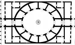 S'il n'est pas strictement elliptique dans sa première phase, ce bâtiment n'en reste pas moins un hapax, un cas unique dans l'Empire romain à l'époque. Sa fonction est inconnue. Il n'y avait pas de sièges susceptibles d'accueillir un public. Les douze niches dans l'espace central ont fait penser dès l'origine à des emplacements pour les douze dieux principaux de l'Olympe, signifiant que l'édifice serait une sorte de panthéon, temple dédié à tous les dieux[78]. Certains ont voulu voir dans la forme ovale centrale la représentation schématique de l'œkoumène, le monde connu des Romains, mais les preuves sont maigres[95].