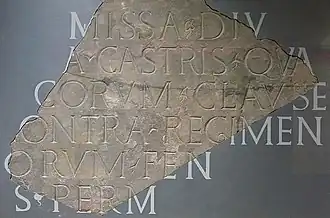 Parmi les nombreuses découvertes ponctuelles, l'épigraphie est particulièrement documentée à Deva Victrix, avec notamment une inscription découverte à proximité du quartier général du camp (principia). Cette inscription, découverte lors des travaux des halles marchandes, est un fragment d'un texte beaucoup plus long. Elle est réalisée sur de l'ardoise galloise. David J. P. Mason dit à son propos qu'il s'agit d'un spécimen rare : un texte administratif et politique de première importance, traduisant une décision publique importante au plus haut niveau du gouvernement de la province[78]. Il pourrait s'agir d'un traité passé avec une tribu locale, ou une déclaration de droits pour la communauté vivant autour de Deva. Le texte ne peut pas être intégralement reconstitué à partir du seul fragment conservé, mais il mentionne clairement la forteresse, une « conclusion amicale » réalisée entre deux partis, et un individu ayant manifesté un comportement « contre les lois et le régime de l'empire »[78].
