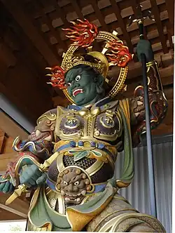 Au Japon, Jikoku-ten est représenté muni d'une lance ou d'un sabre, sous des traits courroucés[1].