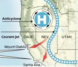 Le vent de Santa Ana, c'est un vent catabatique[Note 1] engendré par l'écoulement gravitaire de la masse d'air présente dans les High Deserts californiens ou du Nevada et qui affecte le sud de la Californie[3]. Ce phénomène est canalisé et accéléré par l'écoulement à travers les échancrures[6],[Note 2]. Cependant, des phénomènes de ressaut hydraulique peuvent se produire quand il rencontre une chaîne de montagne perpendiculaire à sa progression.