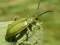 Sa livrée est jaune verdâtre à vert lime. Sa tête est petite, quelque peu effilée, et maculée de vert orangeâtre. Ses antennes atteignent le 2/3 du corps. Elles sont fines, la base antennaire jaune blanchâtre, les autres antennomères brun moyen à brun foncé. Son pronotum est vert pâle, très luisant, presque rectangulaire et nettement plus large que la tête. Ses élytres fermés sont parallèles, la partie centrale étant légèrement bombée. Sa couleur varie généralement du jaune verdâtre à vert pomme. La pointe apicale de l'abdomen dépasse un peu les élytres. Le fémur est blanc verdâtre, le tibia et le tarse noirâtres.