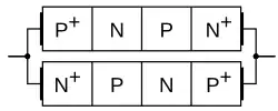 Le diac est composé comme un thyristor d'une triple jonction PNPN (la gâchette est absente). Les extrémités sont plus fortement dopées. L'amorçage se produit lorsque les zones de diffusion des jonctions extrêmes tendent à se rencontrer sous l'effet de l'application d'une différence de potentiel.