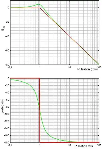 Le diagramme asymptotique est le même que dans le cas précédent. Les pôles de la fonction de transfert sont complexes et conjugués, à partie réelle négative. Lorsque , le système présente une résonance. Le maximum du module de la fonction de transfert est alors en . La pulsation correspondant au maximum est donc toujours inférieure à .