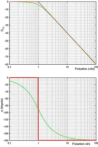 Dans un repère logarithmique, se traduit par une pente de -20 dB/décade ou encore -6 dB/octave. On parle également de pente -1. Le diagramme de Bode asymptotique du module se résume donc à deux tronçons linéaires.