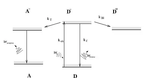 Un Diagramme de Perrin-Jablonski, nommé d'après les physiciens français et polonais Francis Perrin et Alexandre Jabłoński, représente les états électroniques d'une molécule et les transitions entre ces états. L'axe vertical indique le niveau d'énergie, tandis que les états sont groupés horizontalement selon leur multiplicité de spin. Les transitions radiatives sont symbolisées par des flèches droites tandis que les non-radiatives le sont par des flèches ondulées.