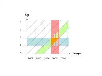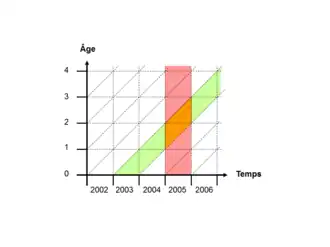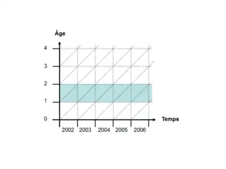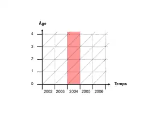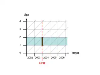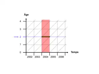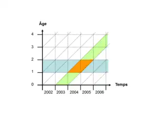 Le segment orange sur la figure 8, intersection entre l’horizontale à 2 ans exacts et le couloir vertical de l’année 2004, montre la localisation de l’effectif des individus ayant fêté leur 2e anniversaire en 2004, ou, en suivant les oblique, l’effectif de la génération 2002 à 2 ans exacts.