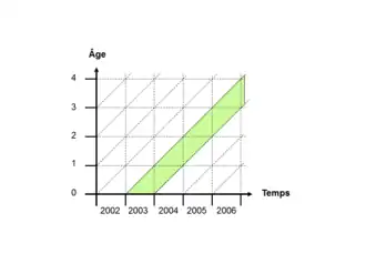 Sur la figure 6, c’est le couloir oblique de la génération 2003 (soit les individus nés en 2003) qui est mis en évidence : tout événement survenu pour des individus nés en 2003 doit se localiser dans ce couloir.