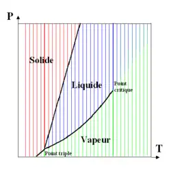 - entre une phase liquide et une phase vapeur : vaporisation - liquéfaction ; la courbe de changement d'état liquide-vapeur s'interrompt en un point appelé point critique, au-delà duquel[note 3] le corps ne présente plus qu'une seule phase fluide, plutôt proche (du point de vue de ses propriétés physiques) d'un gaz[note 4] aux pressions inférieures à la pression critique, plutôt proche d'un liquide aux pressions supérieures à la pression critique.