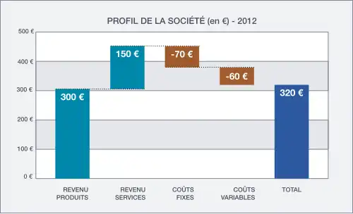 Un diagramme en cascade peut également permettre de comprendre comment se construit le résultat d’un exercice, en partant du chiffre d’affaires, puis en enlevant par exemple les coûts fixes puis variables pour arriver à l’EBITDA, dont on soustrait les dépréciations et amortissements pour parvenir à l’EBIT, dont on soustrait les impôts, pour finir avec le résultat net.
