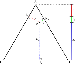 - ↑ Leur somme étant égale à la hauteur h du triangle d'après le théorème de Viviani, ces distances sont respectivement égales à ah, bh et ch.