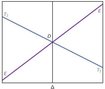 La figure 1 montre le diagramme de type D. La ligne verticale au centre du diagramme représente la situation de l'ion isolé (lorsque Δo = 0) et sur cette ligne est indiquée l'énergie de son terme spectroscopique (D). A partir de l'ion isolé, lorsqu'un complexe se forme, la symétrie n'est plus sphérique et le terme spectroscopique est divisé en différents états électroniques, en fonction de la géométrie du complexe formé. Par exemple, dans un ion d1 tel que Ti3+, l'ion isolé possède un terme spectroscopique 2D. Lorsqu'un ion octaédrique est formé, ce terme se divise en deux niveaux étiquetés 2T2g et 2Eg, et la différence d'énergie entre ces deux niveaux augmente à mesure que l'intensité du champ de ligands augmente, se déplaçant davantage vers la droite dans le diagramme. La partie droite du diagramme permet ainsi de prédire que dans les complexes octaédriques Ti3+ une seule bande d'absorption est présente, correspondant à la transition de l'état 2T2g à l'état 2Eg. Notez que le diagramme d'Orgel n'indique ni la multiplicité de spin ni l'indication de symétrie « g » (par exemple, il indique T2 et non 2T2g), de sorte qu'il est également valable pour d'autres configurations dn et pour les complexes octaédriques et tétraédriques. Ainsi, le côté droit du diagramme D est valable à la fois pour les complexes octaédriques d1 et d6, ainsi que pour les complexes tétraédriques d4 et d9. De même, la partie gauche du diagramme D illustre la situation des complexes octaédriques d4 et d9 et des complexes tétraédriques d1 et d6. Le diagramme indique que dans le spectre d'absorption de tous ces complexes à champ faible, une seule bande d'absorption sera présente[4]. Les correspondances décrites entre les complexes octaédriques et tétraédriques proviennent de raisons de symétrie et dérivent de la manière dont les termes électroniques se séparent en différents états électroniques, en fonction de la géométrie du complexe formé, comme indiqué dans le tableau 1. On peut voir que les termes de type D se séparent toujours en états de type E et T2, quel que soit le nombre d'électrons d et la géométrie octaédrique ou tétraédrique du complexe[5].