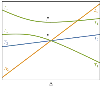 La figure 2 montre le diagramme de type F et P. De même que dans le cas précédent, la ligne verticale au centre du diagramme représente l'ion isolé indiquant les valeurs énergétiques de ses termes spectroscopiques F et P. À partir de l'ion isolé, lorsqu'un complexe est formé, les termes spectroscopiques se divisent en différents états électroniques, en fonction de la géométrie du complexe formé, et la désignation de symétrie change. Le terme de type F se divise en états ayant une symétrie T1, T2 et A2, tandis que le terme de type P devient T1. Ainsi, le côté droit décrit la situation des complexes octaédriques d2 et d7, et des complexes tétraédriques d3 et d8. La partie gauche est valable pour les complexes octaédriques d3 et d8, et pour les complexes tétraédriques d2 et d7. Le diagramme indique que dans le spectre d'absorption de tous ces complexes à champ faible, il y aura trois bandes d'absorption[4]. Enfin, on peut noter que les deux niveaux T1 ont la forme de deux courbes, tandis que toutes les autres lignes sont droites. Cela se produit parce que lorsque deux niveaux ont la même symétrie, ils interagissent l'un avec l'autre en essayant de s'éviter, avec pour résultat que le niveau supérieur a tendance à croître en énergie tandis que le niveau inférieur a tendance à diminuer[4].