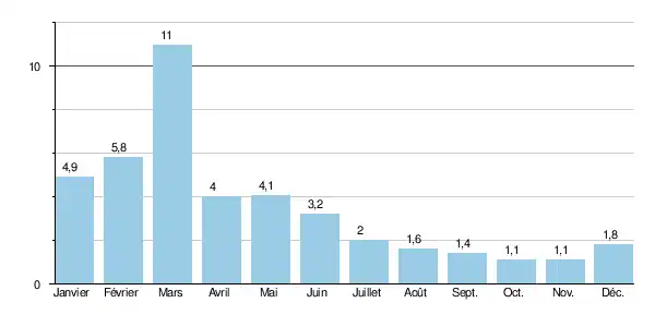 Le débit de la crue annuelle s'élève à 500 m3/s et la crue décennale à 1 906 m3/s.