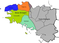 On a coutume de distinguer quatre principaux dialectes du breton correspondant aux anciens évêchés bretonnants, bien que du point de vue linguistique ces limites se révèlent souvent arbitraires :
