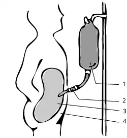 Légende : 1 : dialysat - 2 : cathéter - 3 : cavité péritonéale - 4 : cavité abdominale.