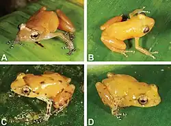 Diasporus citrinobapheus[2] mesure entre 17,3 et 19,7 mm[3] pour les mâles et 21,8 mm pour la seule femelle connue[4]. Son dos est jaune brillant ou orangé nuancé de sombre. Sa face ventrale est translucide hormis le sac vocal du mâle qui est jaune.