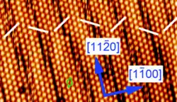 | Image STM de la surface reconstruite (2×2, orientation 0001) de ZrB2[1] | |||
