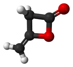 Le dicétène est un composé organique formé par dimérisation du cétène. Le dicétène est un membre de la famille des oxétanes et une lactone. Il est utilisé comme réactif chimique en chimie organique[4]. C'est un liquide incolore qui est généralement stabilisé pendant son stockage par, entre autres, du sulfate de cuivre et qui régénère en le chauffant du cétène monomère. Les cétènes alkylés dimérisent aussi facilement pour former des dicétènes substitués.