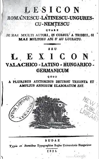 - Lesicon románescu-látinescu-ungurescu-nemțescu quare de mai multi autori, in cursul' a trideci, si mai multoru ani s' au lucratu. Seu lexicon valachico-latino-hungarico-germanicum quod a pluribus auctoribus decursu triginta et amplius annorum elaboratum est., Budae, Typis et Sumtibus Typographiae Regiae Universitatis Hungaricae, (lire en ligne)